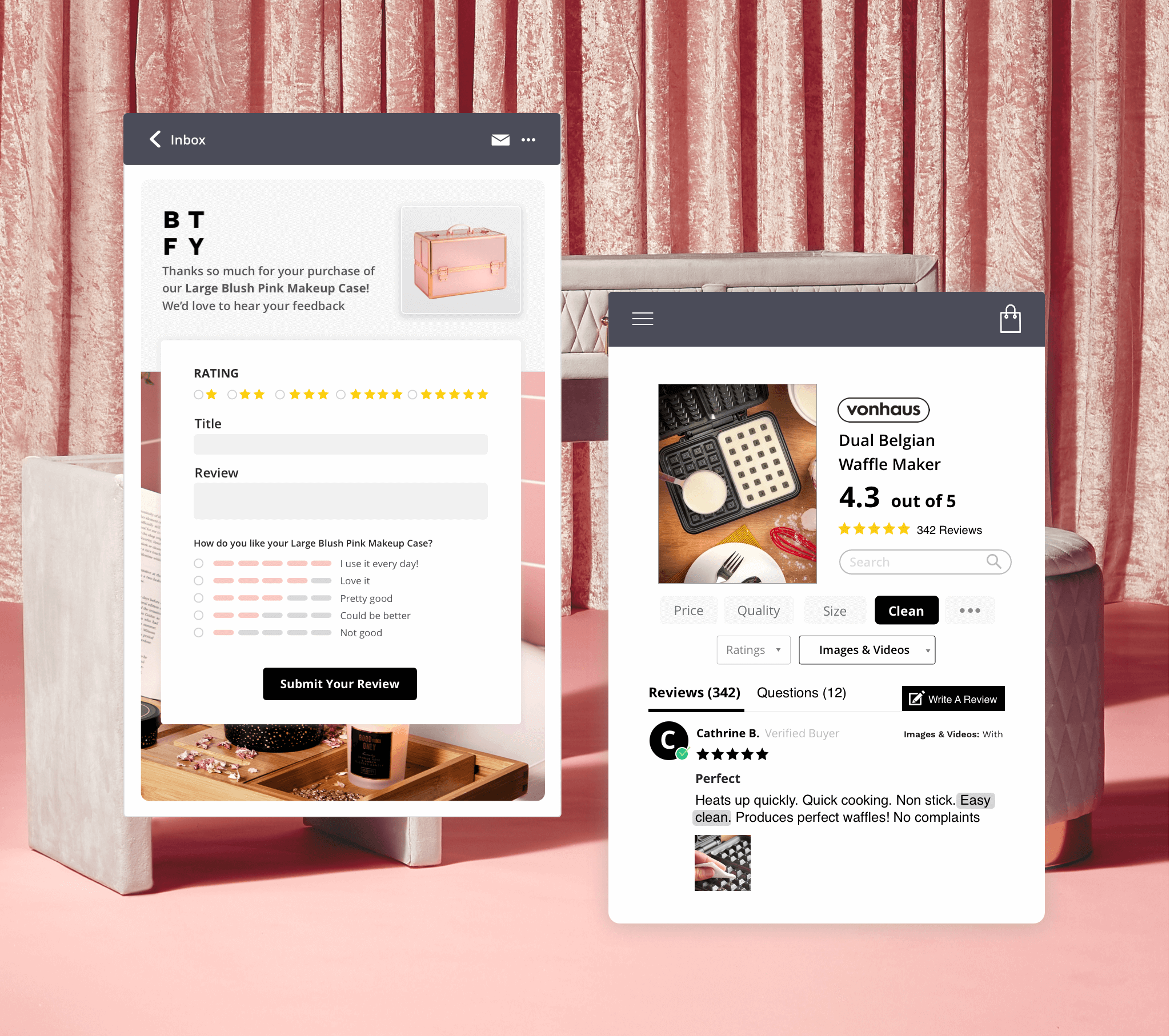 Yotpo’s seamless integration with the Magento Commerce 2 sites enabled DOMU to share authentic customer content through reviews carousels on the Vonhaus and Beautify homepages, as well as in photo galleries on homepages and product pages. Their customized reviews widget allows shoppers to filter reviews to display the ones that contain photos and videos from customers, submitted through review request emails, on social, or directly on the websites.
