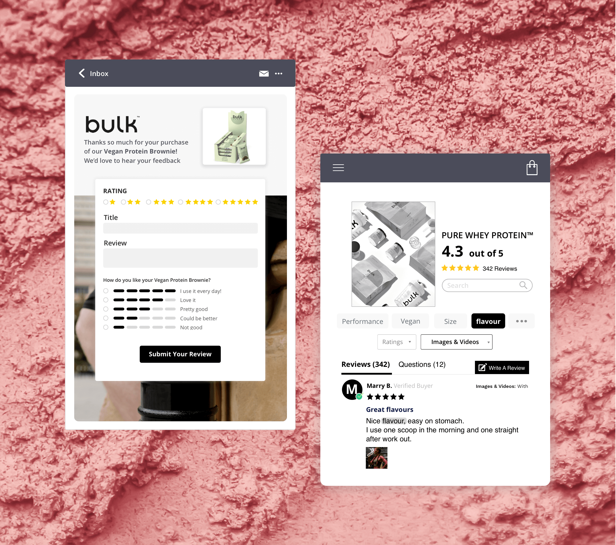 To bolster their brand-building initiative and support their expansion efforts, The Pixel recommended a switch to Yotpo’s solutions for Reviews and Visual UGC, a move that enabled Bulk to tap into the power of authentic customer content on social, in emails, and onsite. As a company that sells nutritional products, Bulk is bound by the restrictions of the FDA, which scans their site on an almost daily basis for incorrect or misleading information. To protect their customers, Bulk wanted to leverage the power of social proof to let shoppers do the talking for them.
