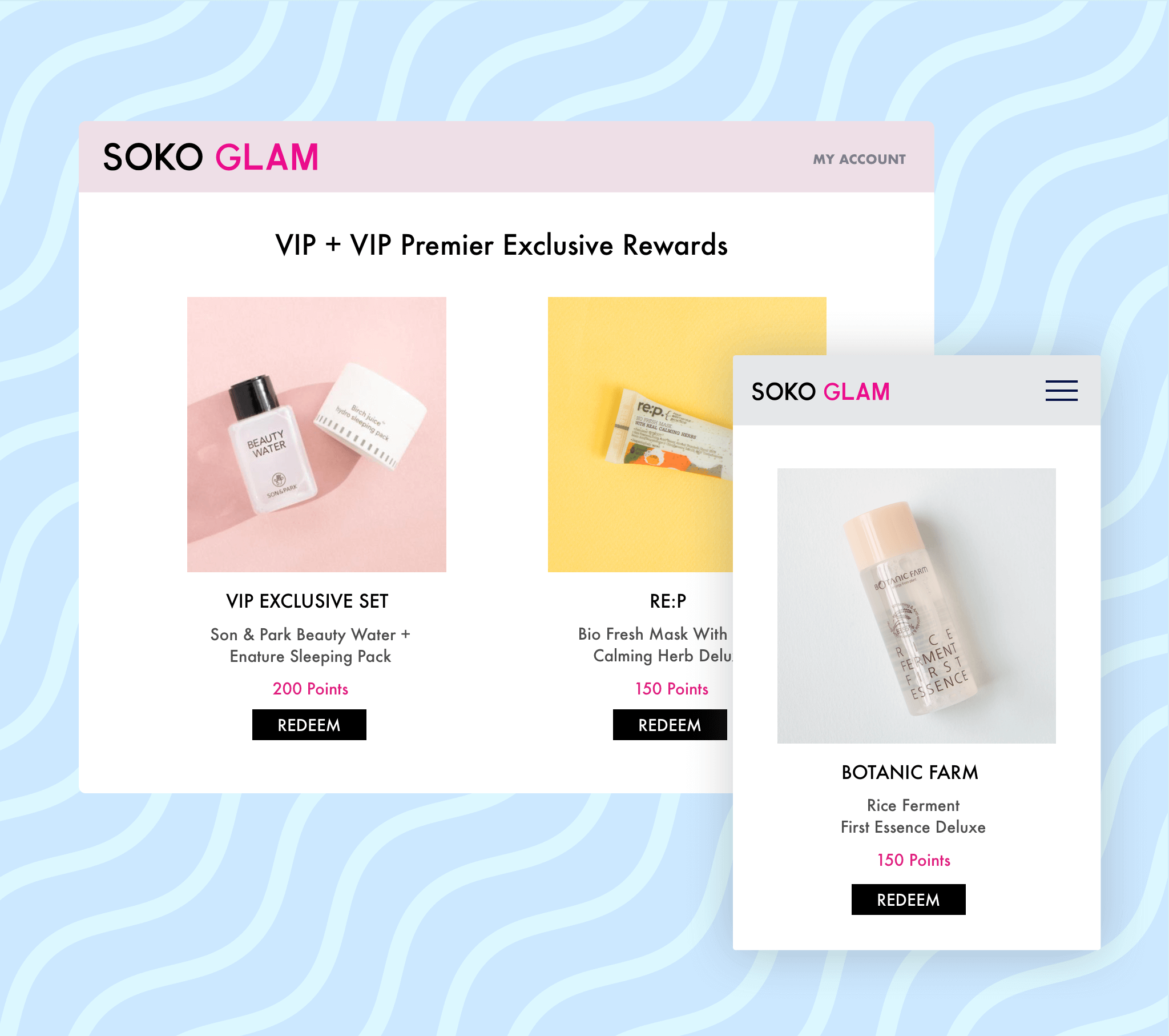 Swell and Soko Glam used a highly collaborative and iterative implementation process to be sure that the final product was built specifically to cater to Soko Glam’s needs. The resulting custom-designed rewards page both complements Soko Glam’s branding and focuses on its goal of creating more repeat purchasers by beautifully showcasing their VIP perks. The page’s primary objective is to create a sense of FOMO that motivates users to reach the top levels of engagement with the brand.