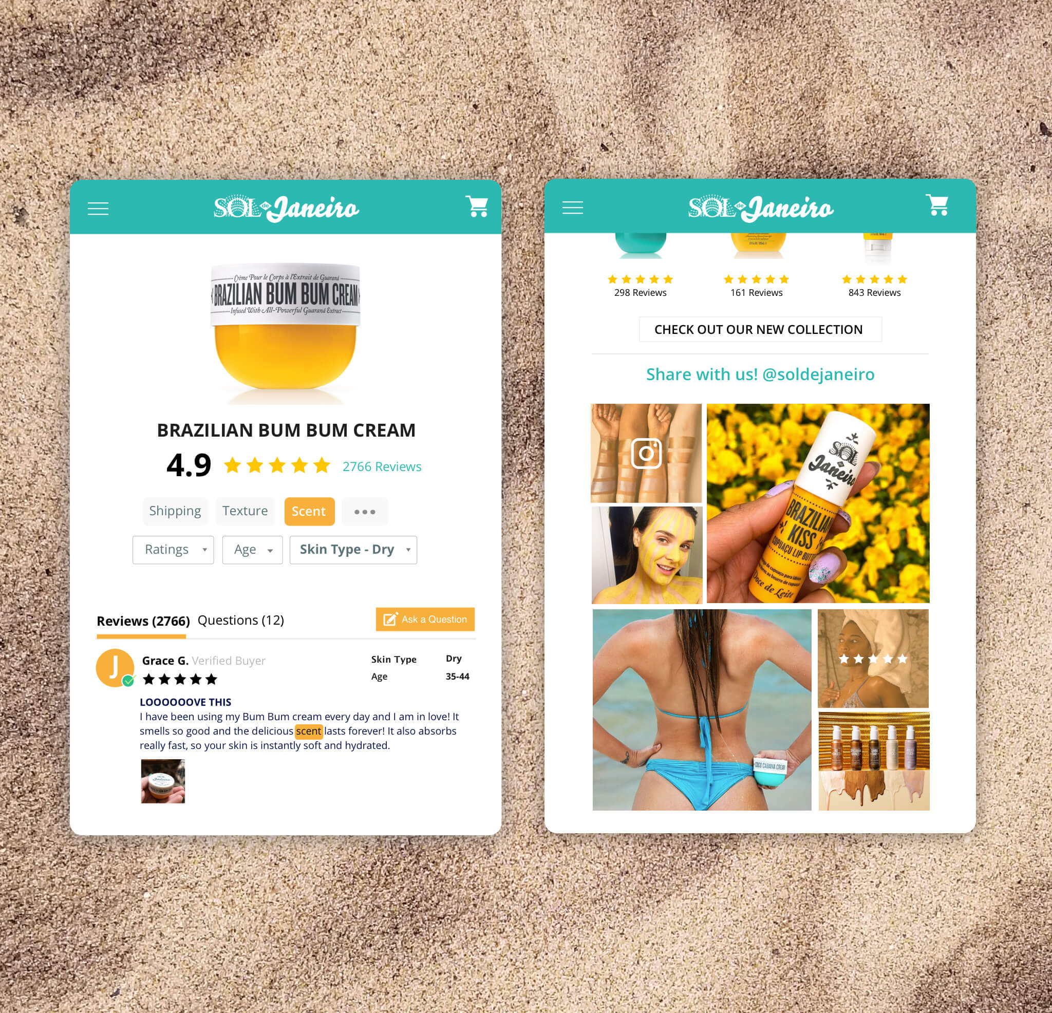Yotpo was hands-on with Sol de Janiero from the very beginning, helping the brand use the tech to its full potential. To collect more reviews and photos, Sol de Janeiro incentivized customers by offering coupons through post-purchase emails. The brand then used Yotpo’s AI smart filters and search to allow customers to sort reviews by topic (fragrance, texture, etc.), or by customer attributes (skin type, skin concern, age), to see content from past buyers with similar needs.