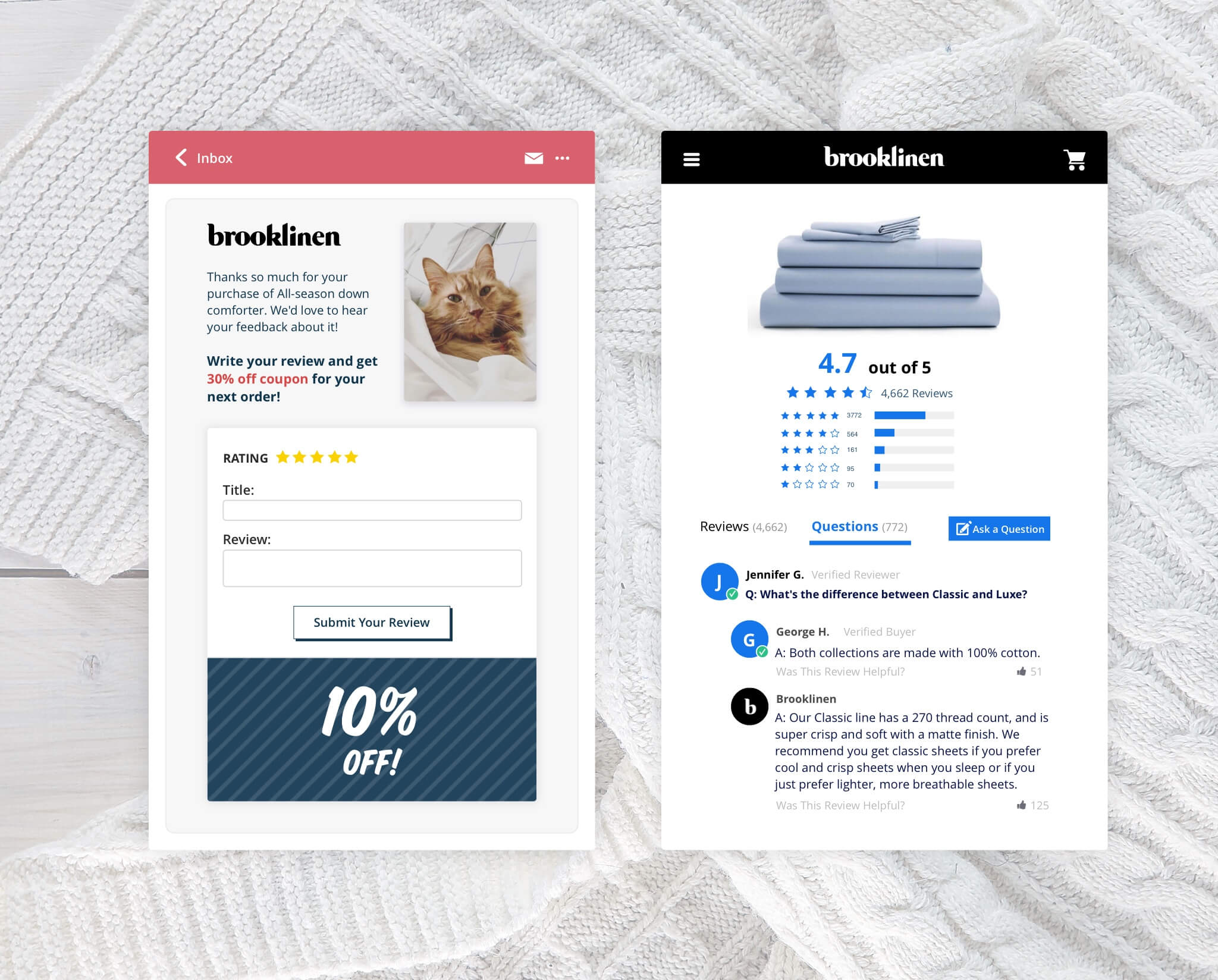 Brooklinen integrated Yotpo across their site, making it super easy for their customers to share feedback, and began to leverage user-generated content throughout the buyer journey. Brooklinen used Yotpo’s coupons and product recommendation upsell features in review requests to incentivize customers to leave reviews and make repeat purchases.
